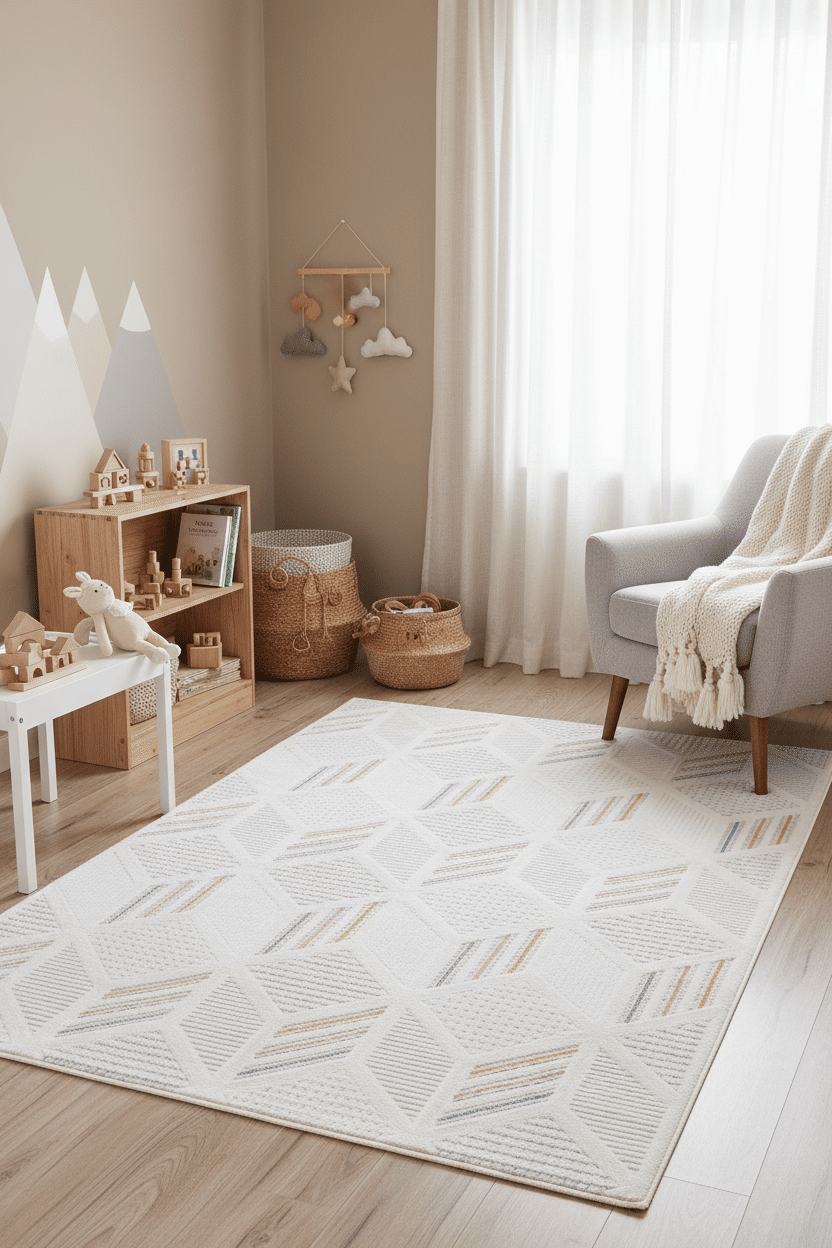 • Escolha a estampa discreta, a medida ideal — e ganhe um quarto que amadurece junto com a criança (sem trocar o tapete a cada fase).